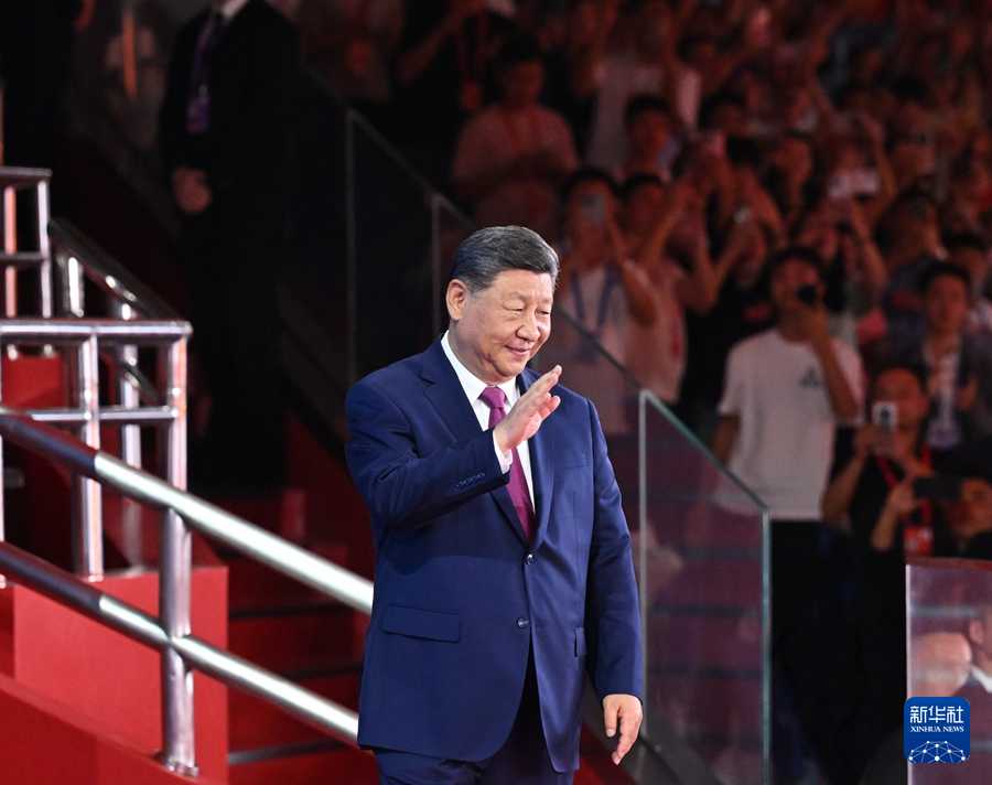 11月9日晚,中共中央总书记、国家主席、中央军委主席习近平在广东省广州市出席中华人民共和国第十五届运动会开幕式并宣布运动会开幕。这是习近平在主席台上向大家挥手致意。新华社记者 燕雁 摄